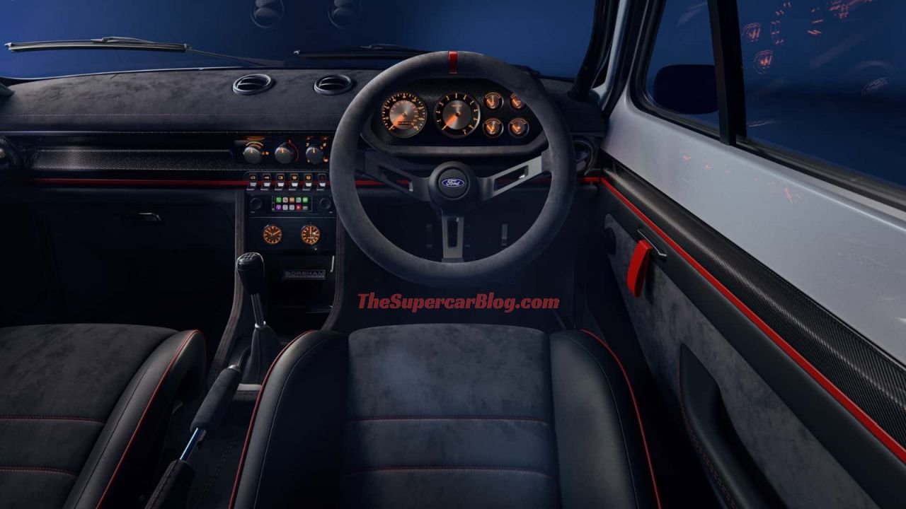 The revamped interior of the Escort Mk1 features black leather upholstery with red accents. The dashboard, door pads, and seats have Alcantara inserts. Boreham has installed an upgraded instrument cluster, which features revised dials and a 3-spoke sports steering wheel wrapped in Alcantara.